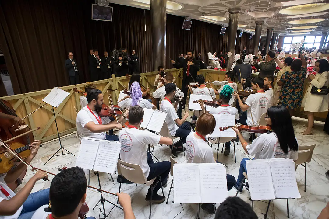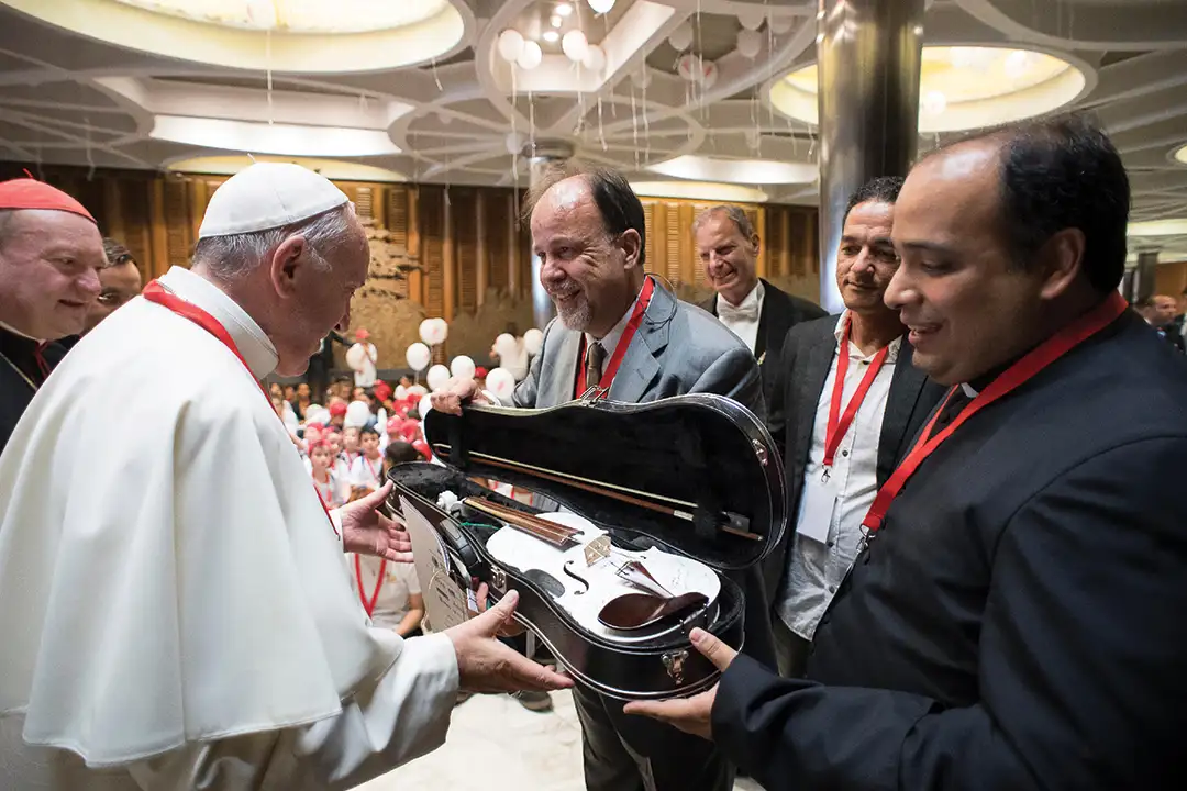 Conosco, do Brasil, levamos também um violino assinado por todos os membros da OMA para presentear o pontífice, a fim de demonstrar nossa imensurável gratidão por aquele momento, além de um violino branco para que pudesse dar-nos a honra de um autógrafo.